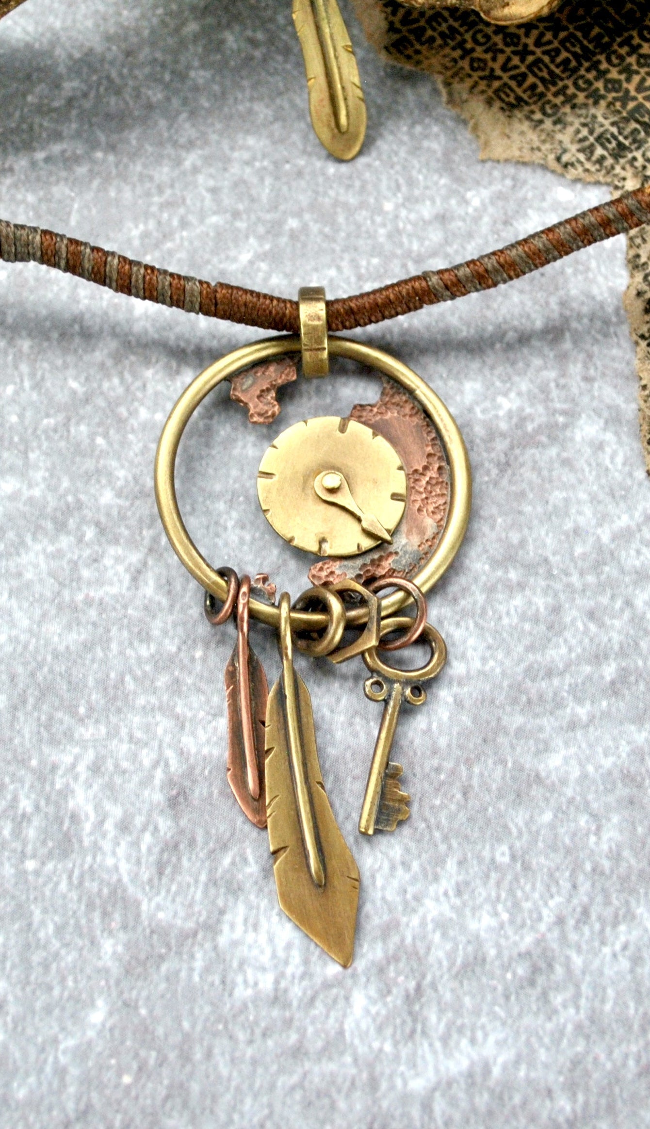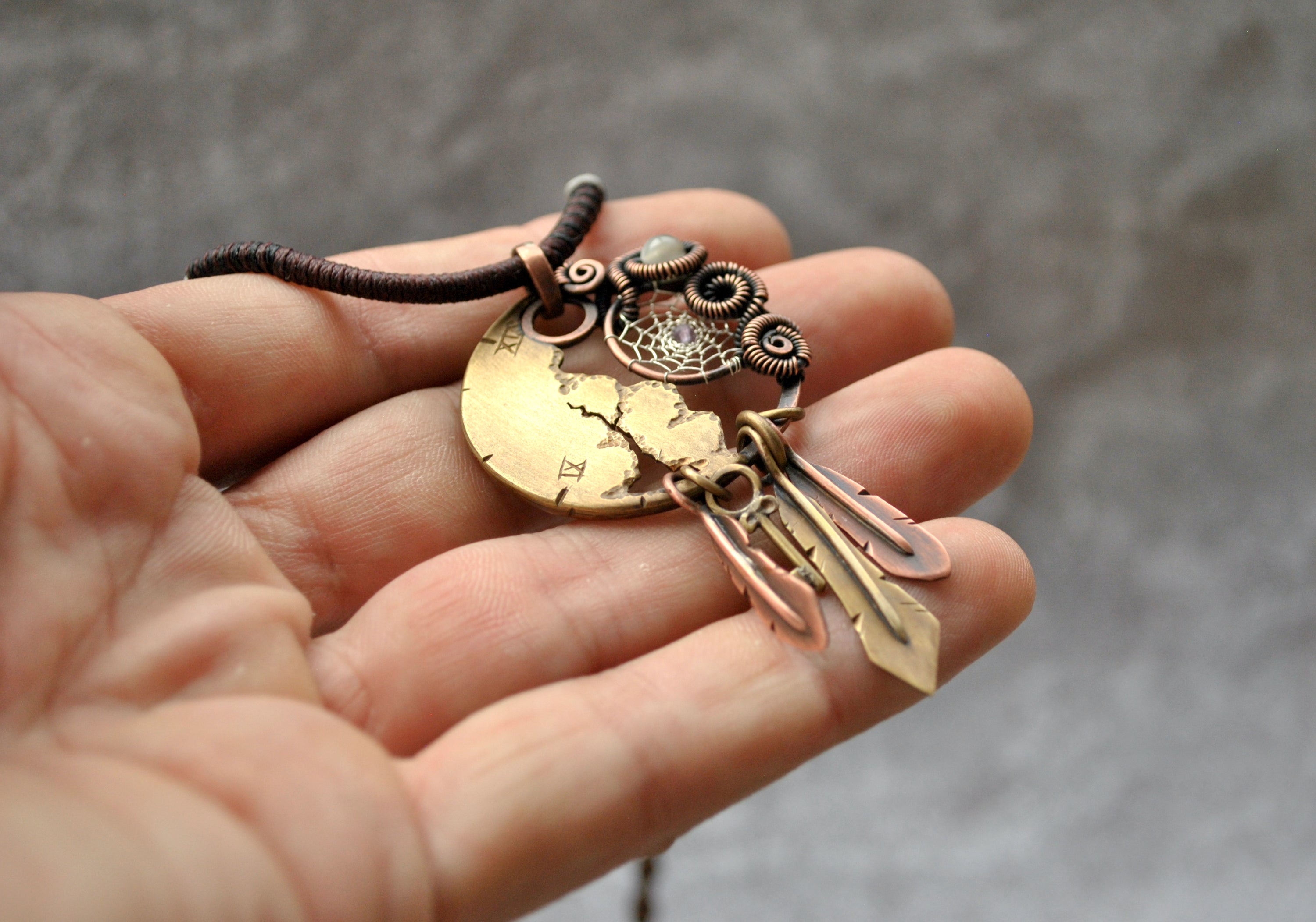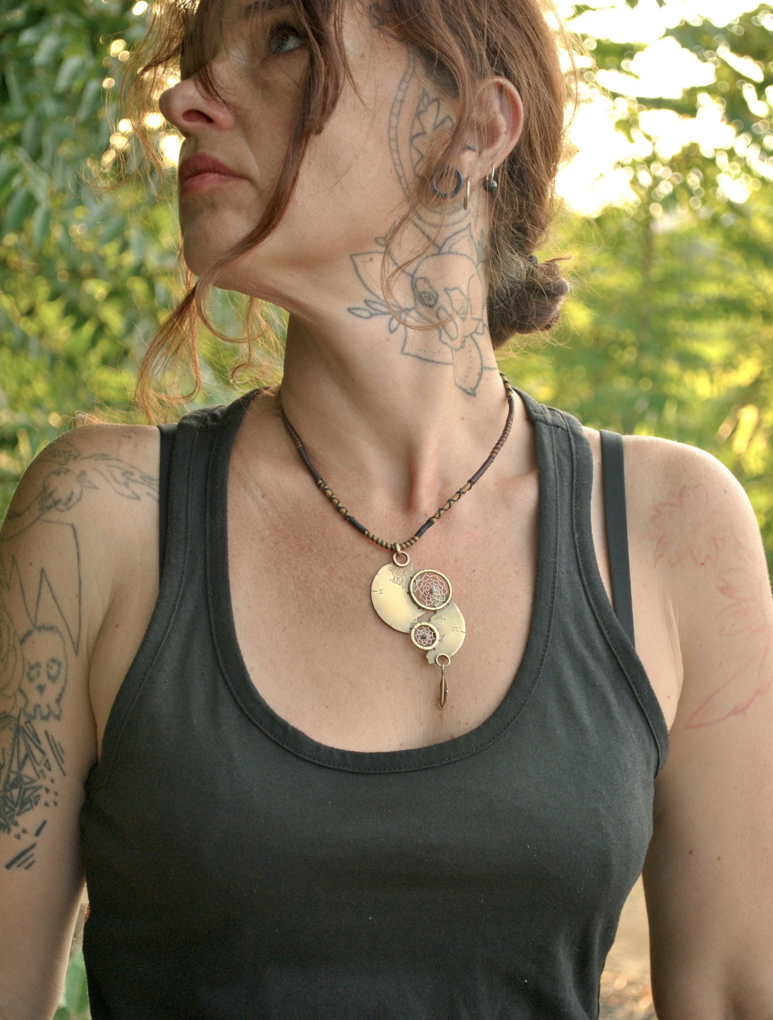 Jewellery of a sci-fi fantasy story. These pieces belong to characters in a distant future and far away world, symbolic amulets and artefacts, made from the remnants of a forsaken past, worn in a chaotic, dystopian setting, each with significance in a winding storyline.