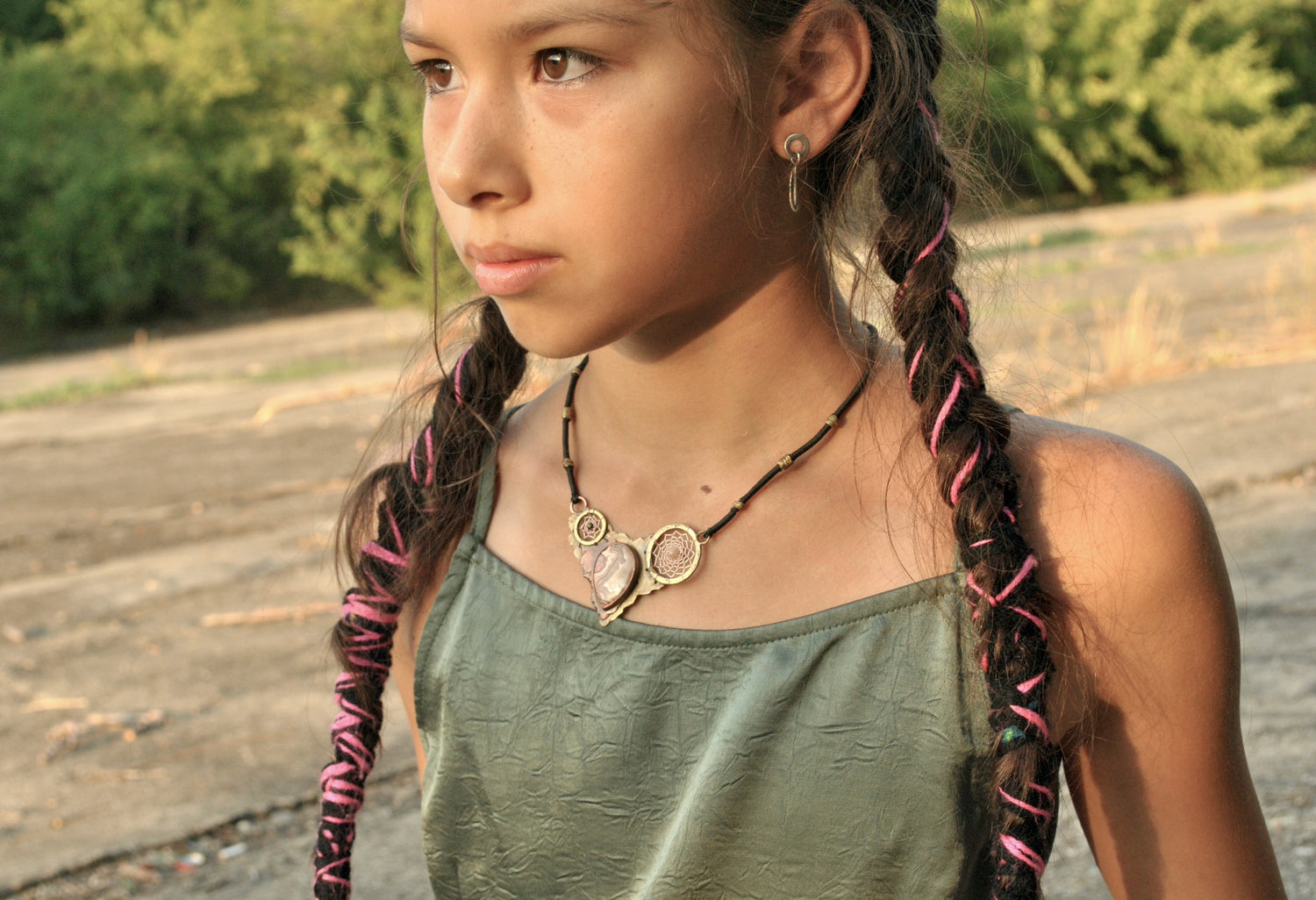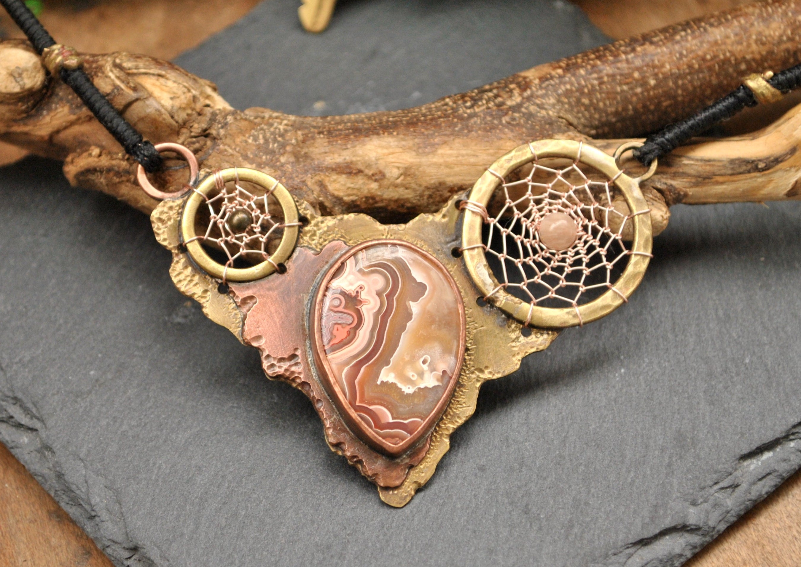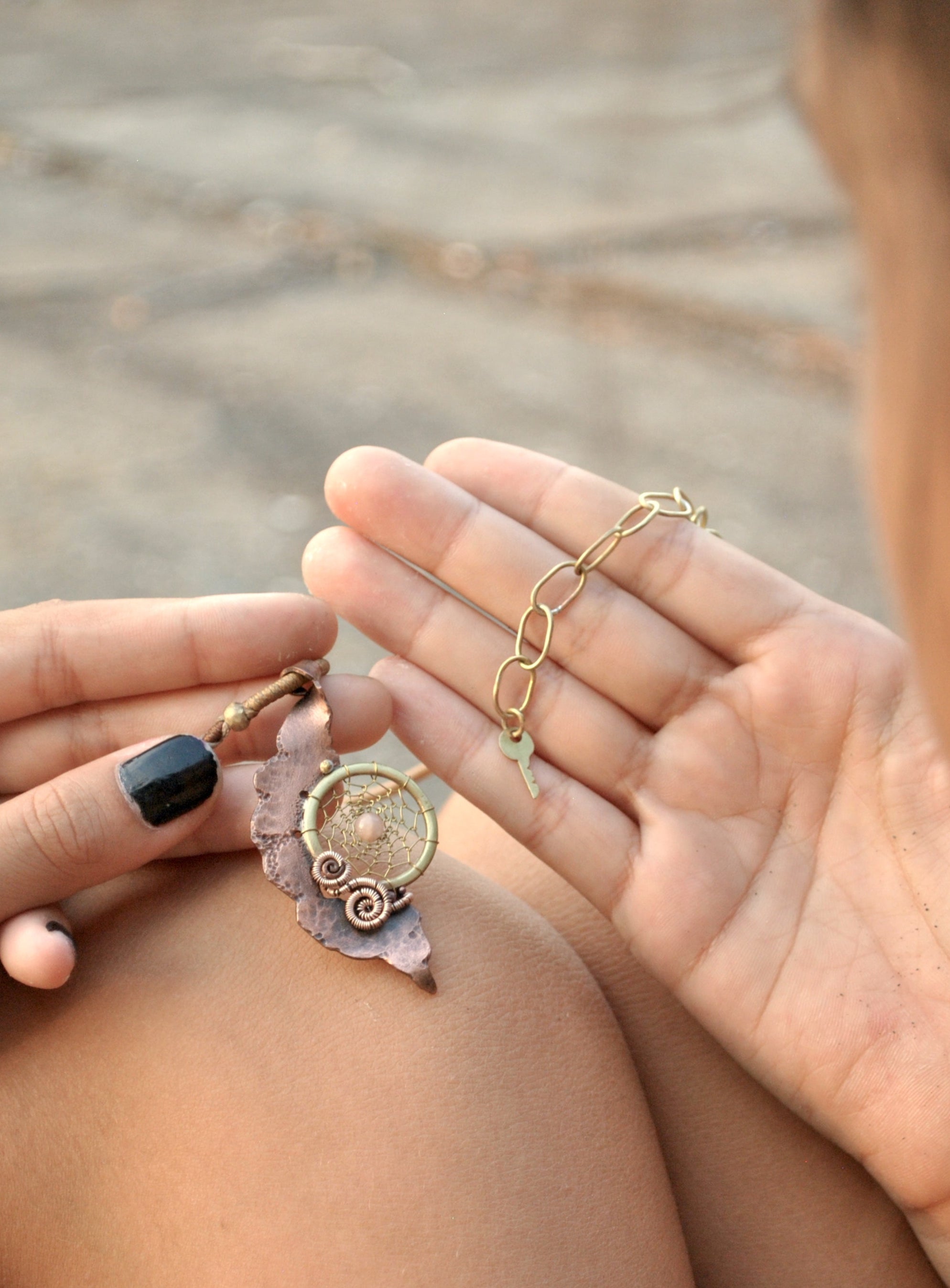 Jewellery of a sci-fi fantasy story. These pieces belong to characters in a distant future and far away world, symbolic amulets and artefacts, made from the remnants of a forsaken past, worn in a chaotic, dystopian setting, each with significance in a winding storyline.