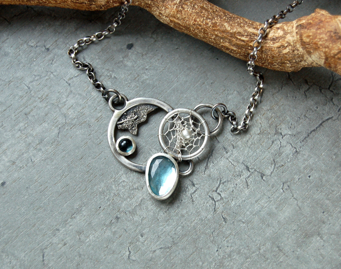 This luxury-boho necklace features vibrant Topaz gemstones and an intricate wire dreamcatcher. While exploring Asymmetrical forms and contrasting textures, this necklace is small enough to wear casually but bold enough to make a statement.